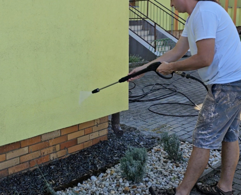 A homlokzattisztító szerek felhordása után vártuk, hogy végezzék a dolgukat. Ezután egy teleszkópos szerszámmal a földről leöblítettük a falakat megfelelő víznyomással és megismételtük a folyamatot, ezúttal természetes tisztítóoldatokkal Isokor Homlokzat a tökéletes tisztítás érdekében.